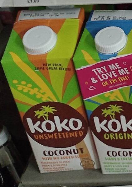 | Ingredients | WATER, COCONUT MILK (7%), CALCIUM PHOSPHATE, EMUSLFIER (SUCROSE ESTER OF FATTY ACIDS), SEA SALT, STABILISER (GELLAN GUM), COLOUR (CAROTENE),VITAMIN D2, VITAMIN B12. |